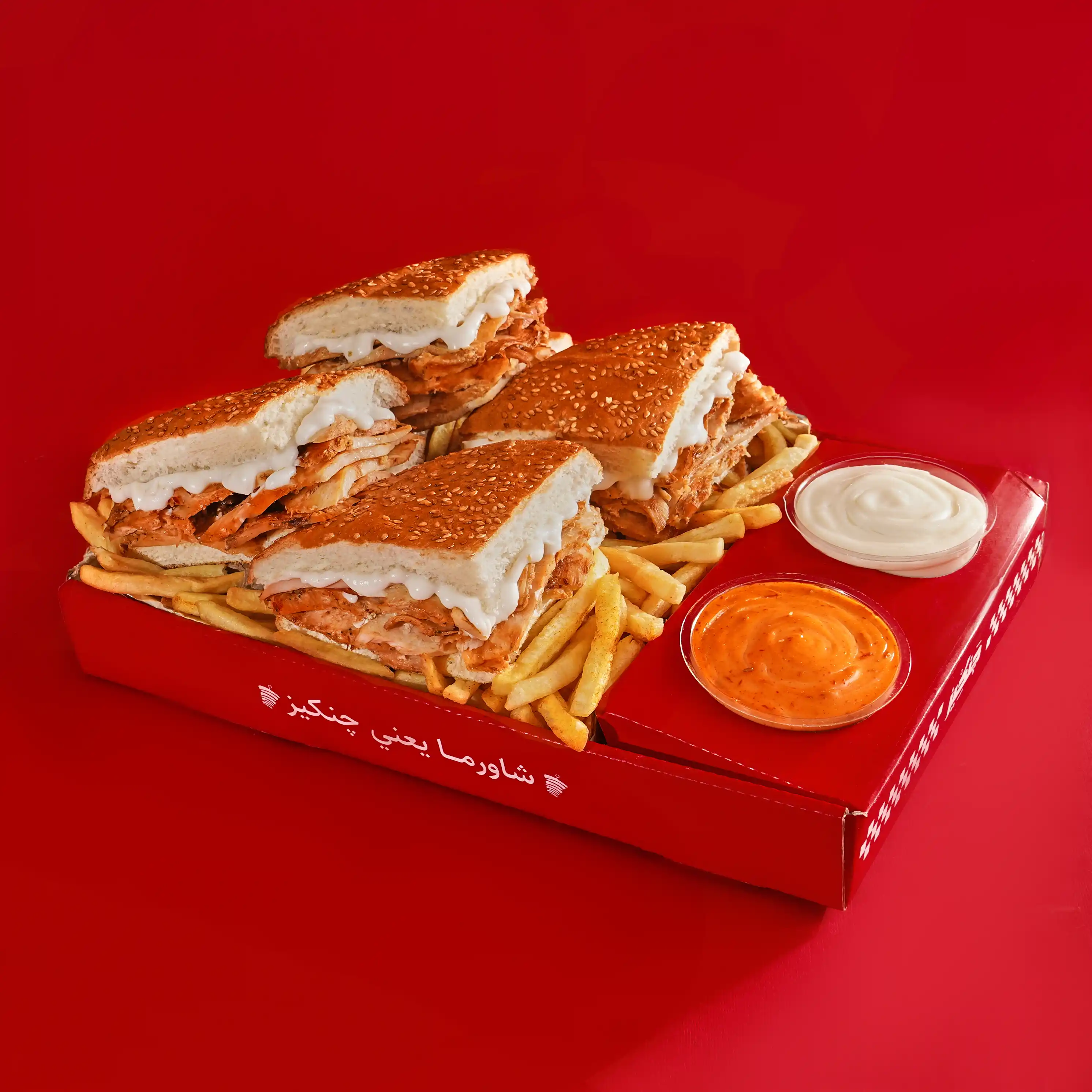 3 قطع شاورما فراخ عربي + 6 قطع شاورما لحمة عربي + 3 قطع كرسبي + بطاطس + 2 كبيبة + 2 سمبوسة + عيش محمص + ثومية + ثومية سبايسي + مخلل