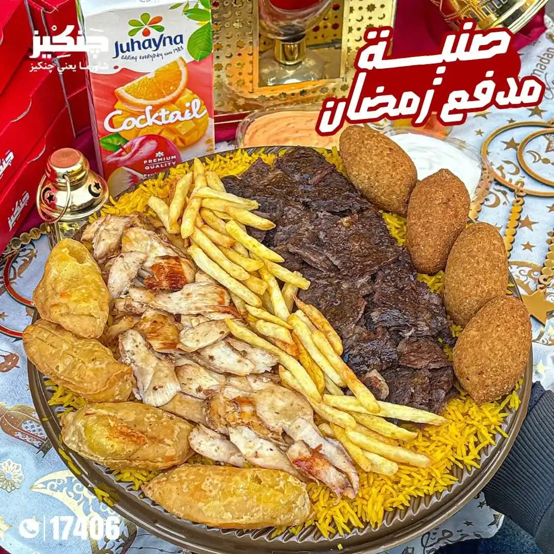ارز بسمتي - شاورما فراخ - شاورما تندوري - 2ق شيش طاووق - 3ق دجاج كريسبي - ثومية - عيش محمص - بطاطس - 4ق كبة مقلية - 4 سمبوسك جبنة - 4 عيش شامي - ثومية - ثومية سبايسي - مخلل مشكل