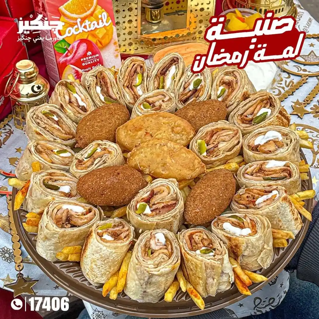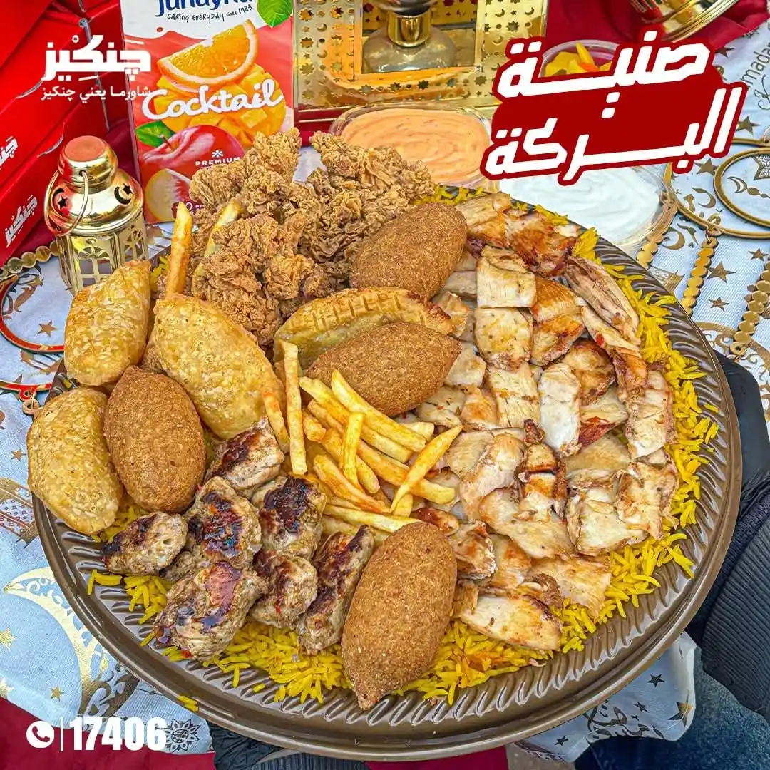 ارز بسمتي - شاورما فراخ - 6ق دجاج كريسبي - ثومية - بطاطس - 4ق كبة مقلية - 4 سمبوسك جبنة - عيش محمص - 4 عيش شامي - ثومية - ثومية سبايسي - مخلل مشكل